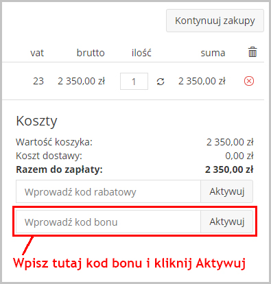 Podczas składania zamówienia w koszyku, wpisz w polu poniższy kod bonu: